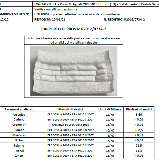 2. Ci sto! Devo assolutamente riuscire a far smettere di inficiare la salute di mio figlio con le mascherine della FCA, e non solo, che mi sembrano ricavate da stracci recuperati in discarica visti gli “ingredienti” rilevati…