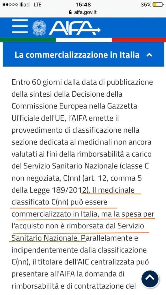 che il farmaco è in classe C(nn), dedicata ai farmaci non ancora valutati ai fini della rimborsabilità – QUINDI NON PUÒ ESSERE DISTRIBUITO A CARICO DEL SSN;
